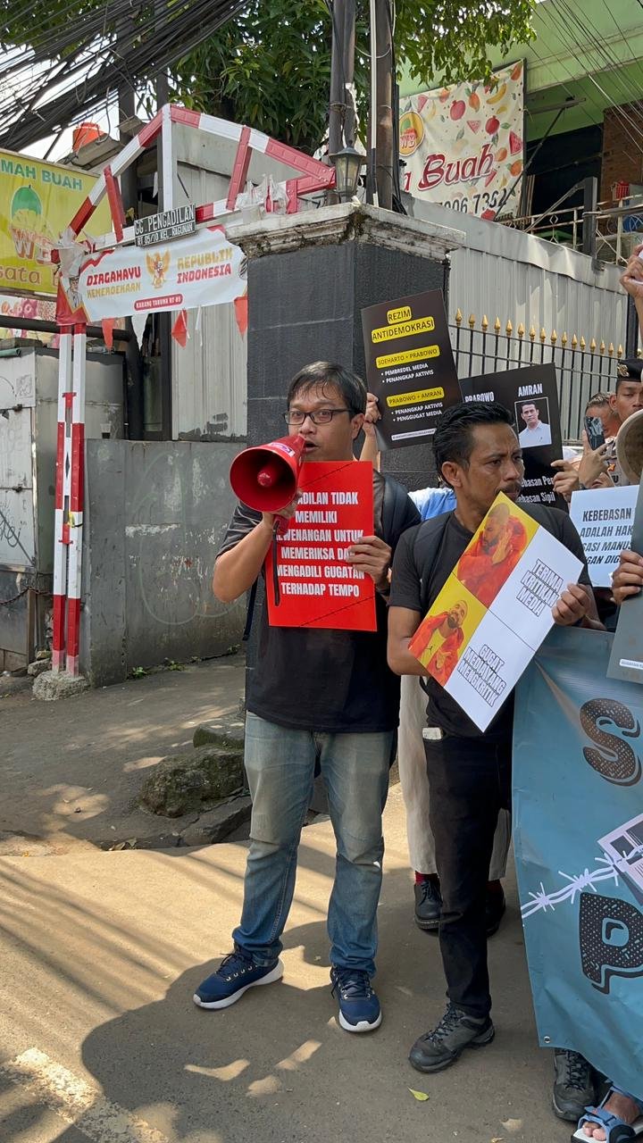 Aksi solidaritas AJI Jakarta mendukung Tempo di depan Pengadilan Negeri Jakarta Selatan terkait gugatan Rp200 miliar oleh Menteri Pertanian Amran Sulaiman.
