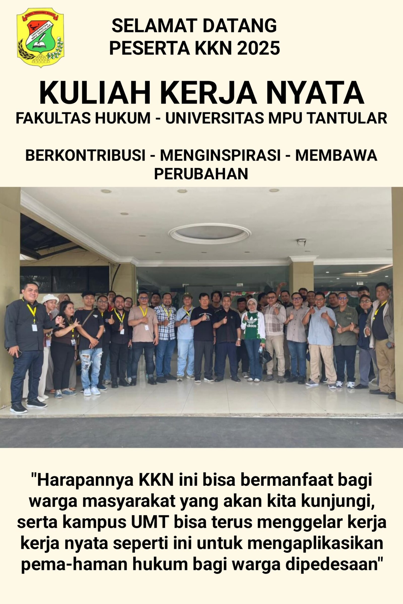 Mediarjn.com, – Desa Bunihayu, – Subang – Jawa Barat. Kuliah Kerja Nyata (KKN) 2025 Fakultas Hukum Universitas Mpu Tantular. Kegiatan KKN ini merupakan bentuk pengabdian kepada masyarakat yang bertujuan untuk menghadirkan kontribusi nyata, memberikan inspirasi, dan mendorong perubahan positif di lingkungan desa.