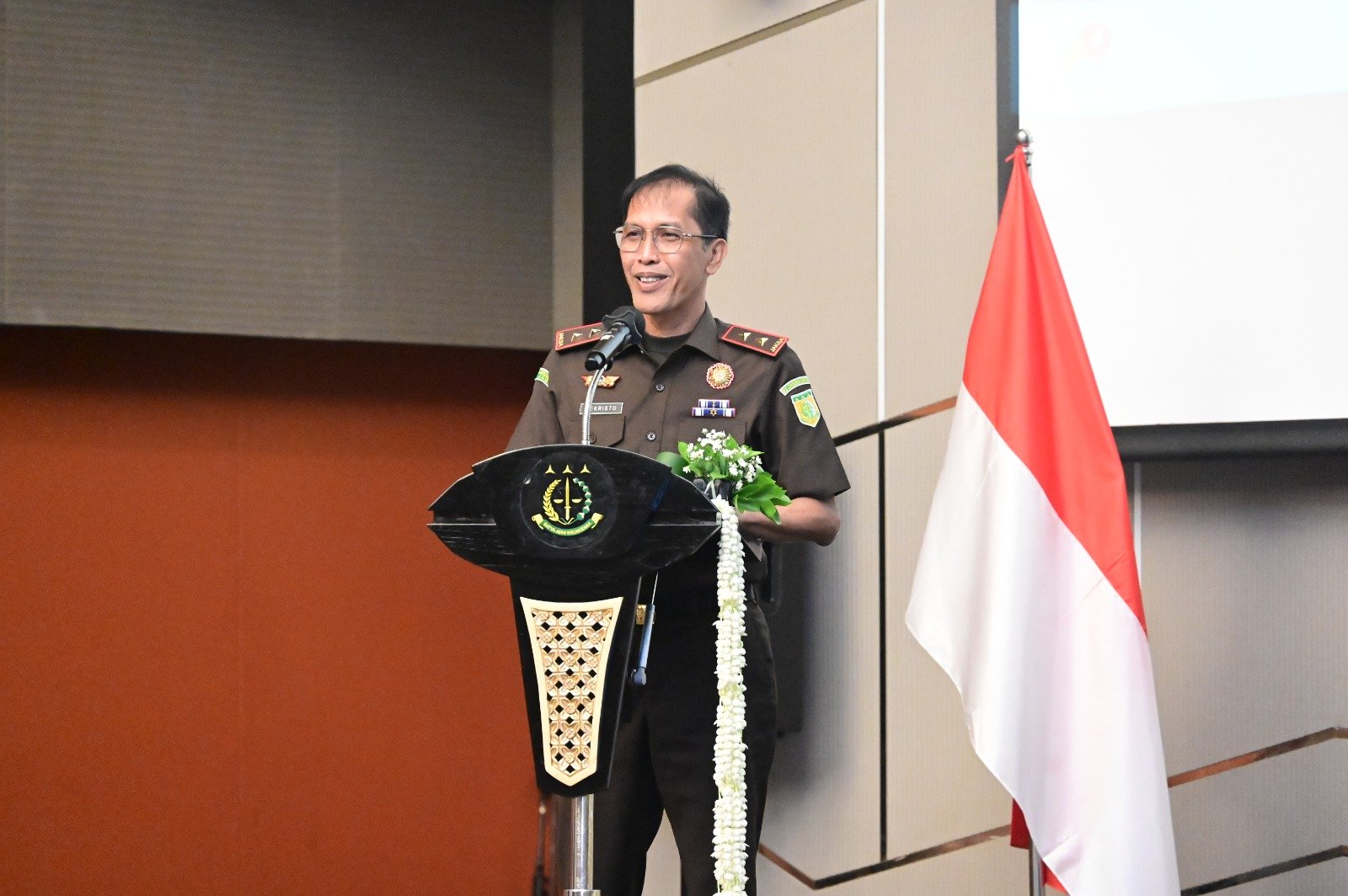 Foto: Pidato pembukaan Rakerda Kejati Jabar 2025 oleh Kajati Hermon Dekristo di Pullman Bandung.