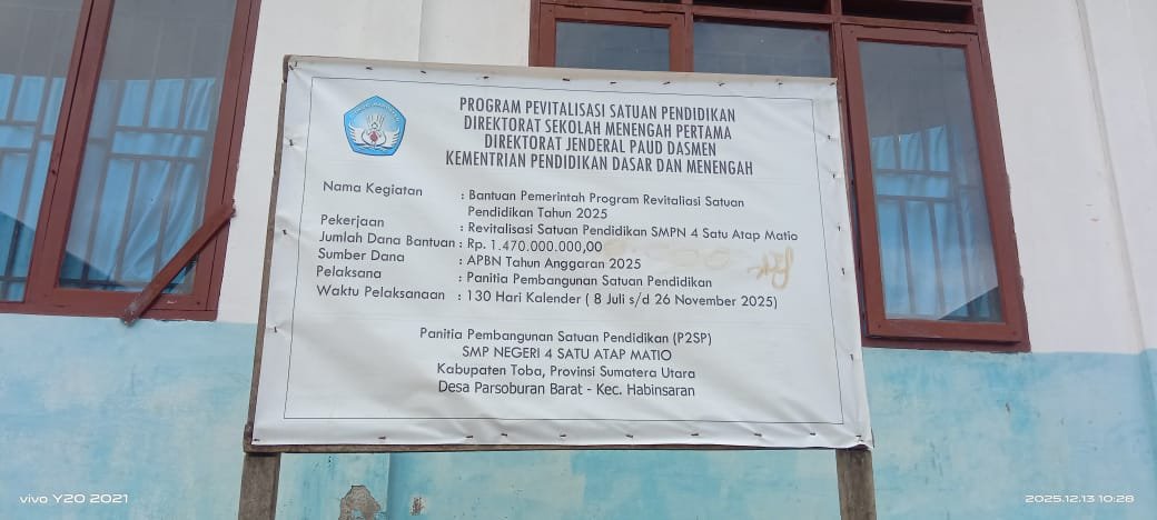 Muara, Toba, – Mediarjn.com – Program Bantuan Pemerintah Revitalisasi Satuan Pendidikan (BPPR) Tahun Anggaran 2025 di SMP Negeri 4 Satu Atap Matio, Kabupaten Toba, Provinsi Sumatera Utara, menjadi sorotan publik. Proyek bernilai Rp1,47 miliar yang bersumber dari APBN 2025 tersebut diduga melampaui batas waktu pelaksanaan 130 hari kalender, yang berakhir pada 26 November 2025.