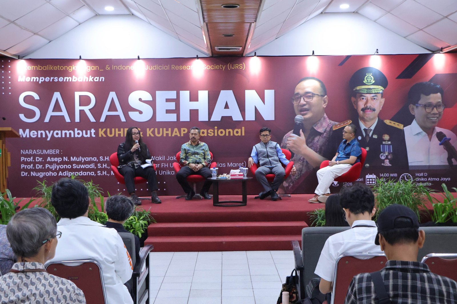 Seminar nasional tersebut juga menghadirkan Ketua Komisi Kejaksaan RI Prof. Dr. Pujiyono Suwadi, S.H., M.H., yang membahas Ketentuan Transisi KUHP Baru serta Pidana Alternatif Penjara. Selain itu, akademisi Fakultas Hukum Unika Atma Jaya Dr. Nugroho Adipradan mengulas perubahan pengaturan delik berita bohong dalam KUHP baru.