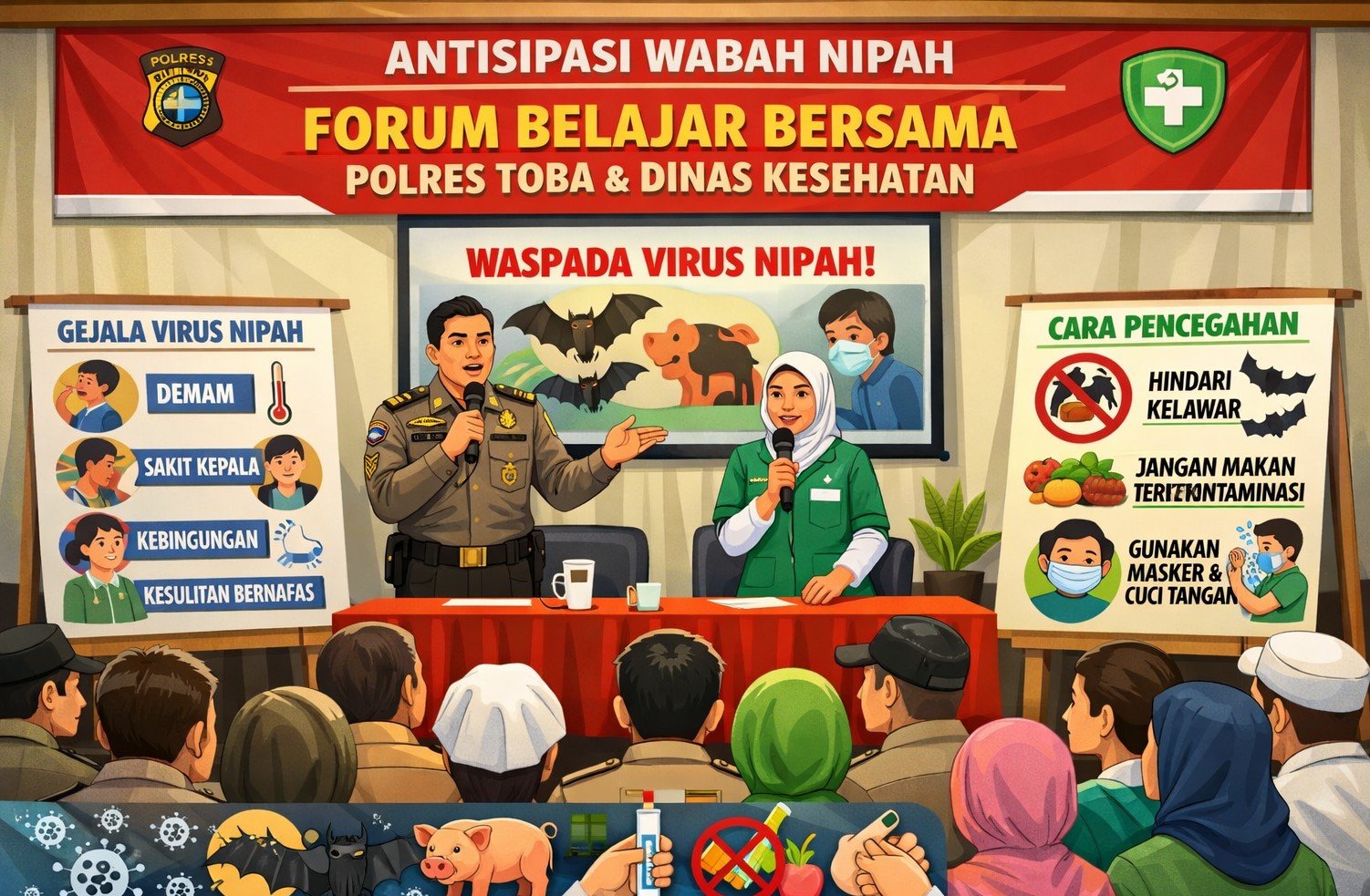 Toba, – Mediarjn.com – Dalam rangka meningkatkan kesiapsiagaan lintas sektor terhadap potensi wabah Virus Nipah, Kepolisian Resor (Polres) Toba, Polda Sumatera Utara, menggelar Forum Belajar Bersama yang melibatkan unsur pemerintah daerah, khususnya Dinas Kesehatan Kabupaten Toba.