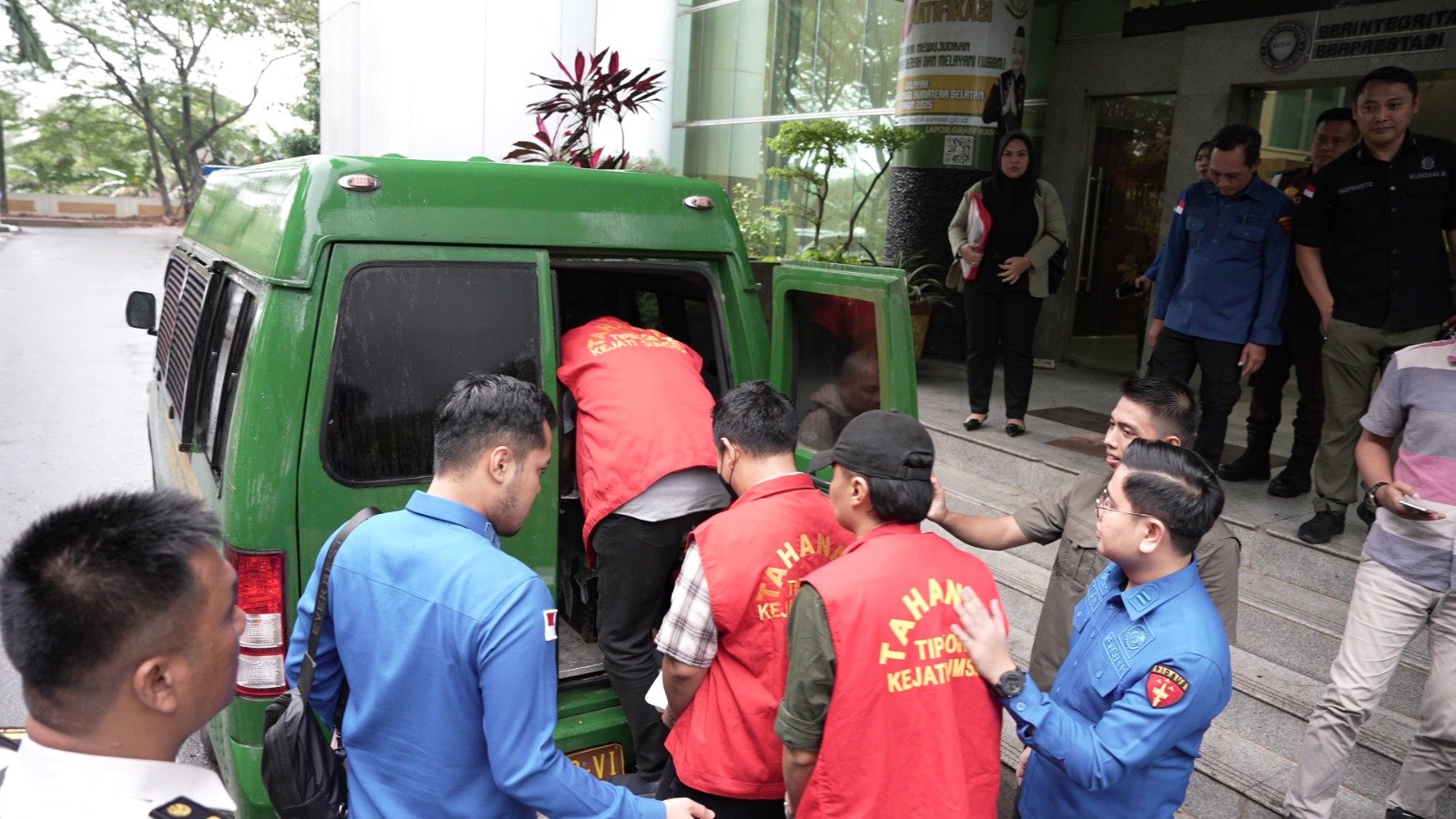 Petugas Kejaksaan Tinggi Sumatera Selatan menyerahkan tujuh tersangka kasus dugaan korupsi KUR Mikro bank pemerintah Cabang Semendo pada Tahap II di Palembang, 12 Februari 2026.