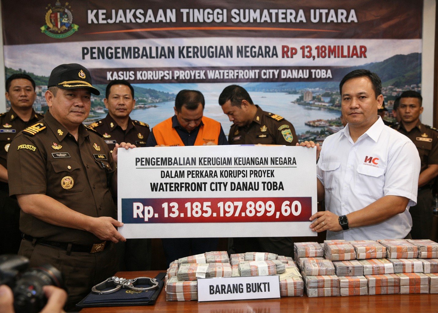 Medan, – Mediarjn.com – Penyidik Tindak Pidana Khusus Kejaksaan Tinggi Sumatera Utara menerima pengembalian kerugian keuangan negara sebesar Rp13.185.197.899,60 dari PT Hutama Karya (Persero) terkait perkara dugaan tindak pidana korupsi pekerjaan konstruksi Penataan Kawasan Waterfront City Pangururan dan Kawasan Tele pada Kawasan Strategis Pariwisata Nasional (KSPN) Danau Toba Tahun Anggaran 2022.