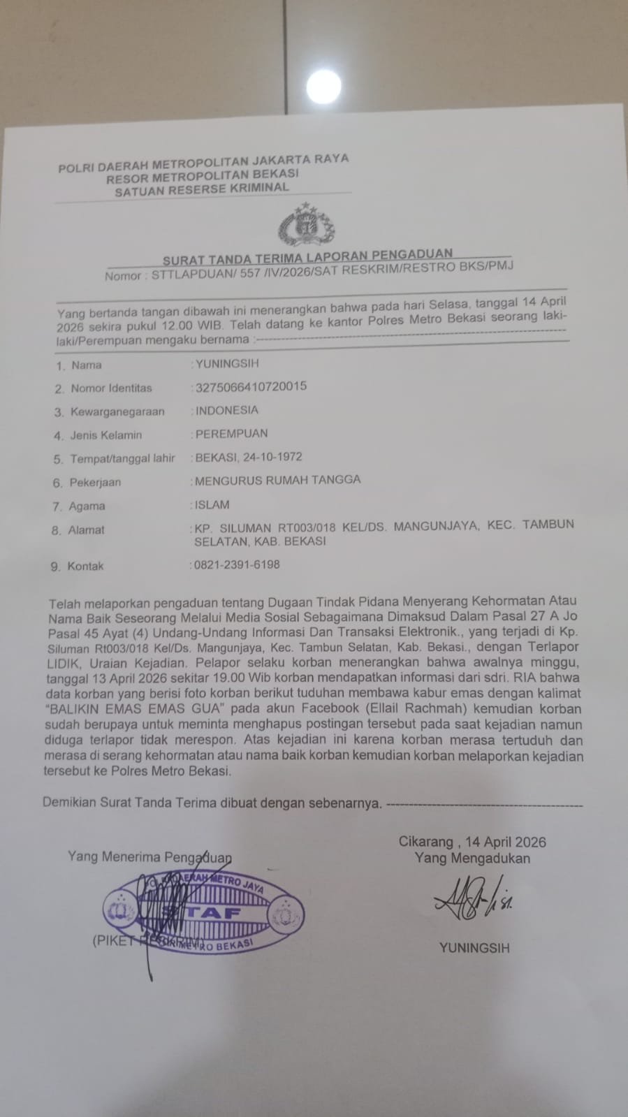 Pada Selasa (14/4/2026), Yuningsih bersama sejumlah warga resmi melaporkan kasus tersebut ke Polres Metro Bekasi. Laporan tersebut tercatat dengan nomor STTLP/557/IV/2026/SAT RESKRIM/RESTRO BKS/PMJ.